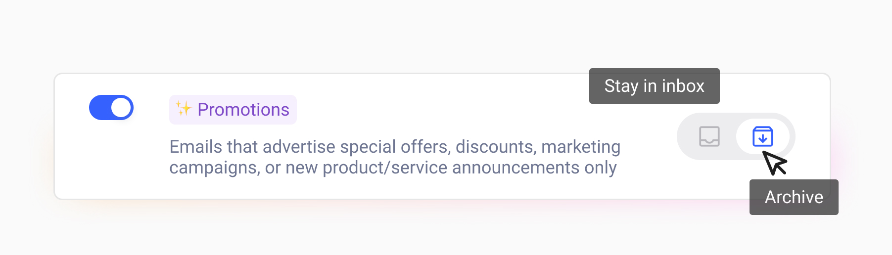 Next to each category in the AI Sorting setup, you'll see an additional control that lets you decide how tagged emails are handled: