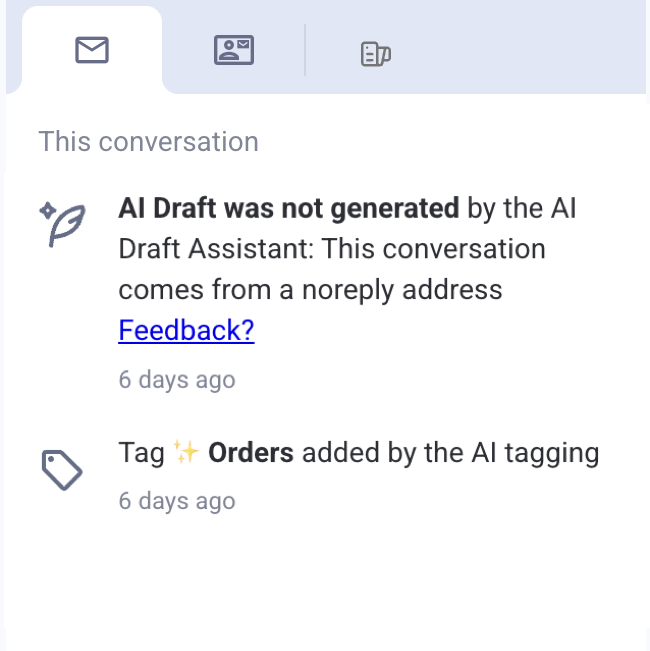 Gmelius AI is smart enough to determine which conversations are suitable for automated draft generation. In cases where our AI determines that a draft is not appropriate or feasible, it will add a Gmelius pulse to the conversation explaining the reasoning behind this decision. This ensures transparency and helps you understand when an assistant is actively working.